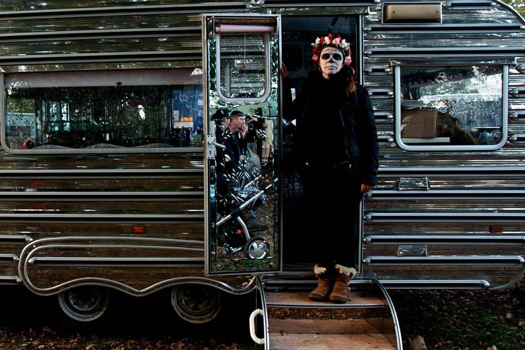 Ramona MOMO, woman with mask in chrome trailer. A4 photo print.