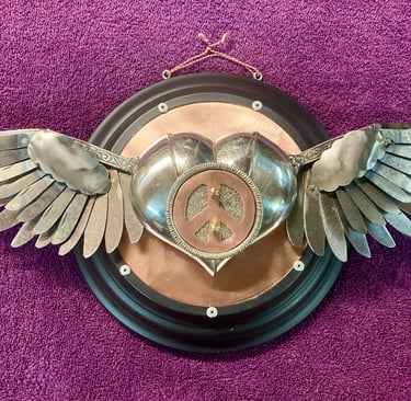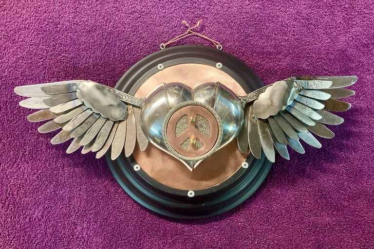 Wall mounted sculpture. A winged heart with a central anti-war motif. Materialsfound objects of steel, copper and brass.A meditation on peace. This unique symbolic artwork takes familiar household objects and transforms them into a message of love, peace and longed for renewal. Starting bid: £120.