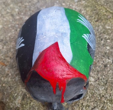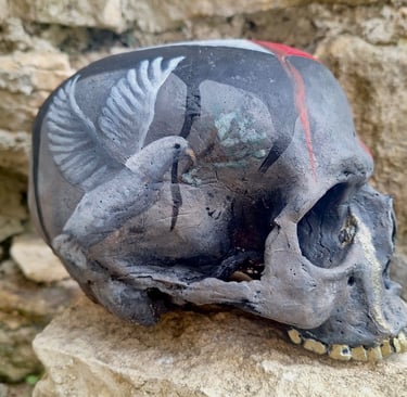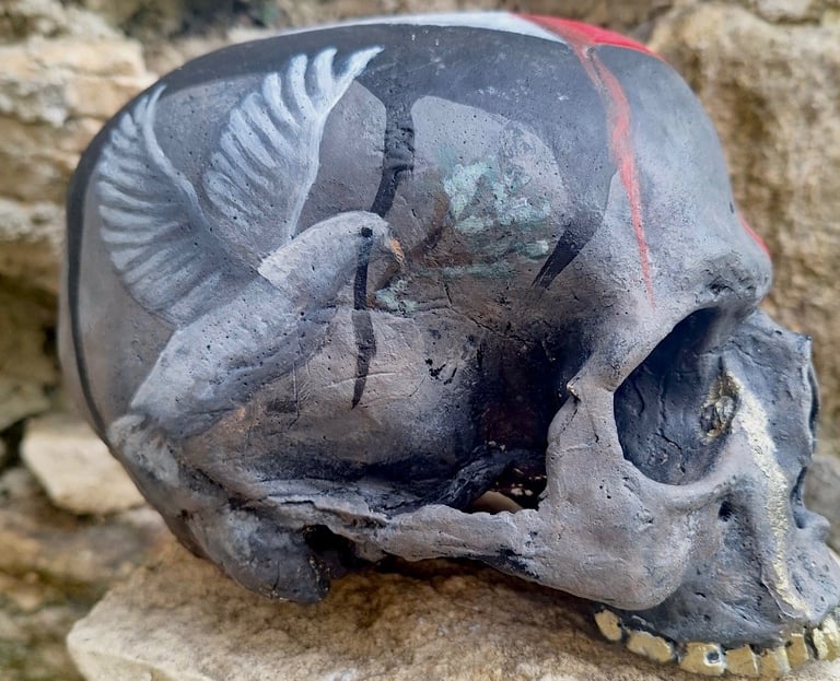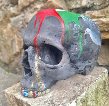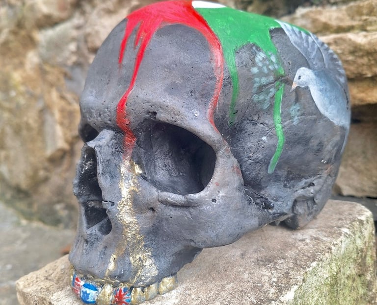 Title “Peace Not profit”: life size plaster cast of human skull. Starting bid: £50.