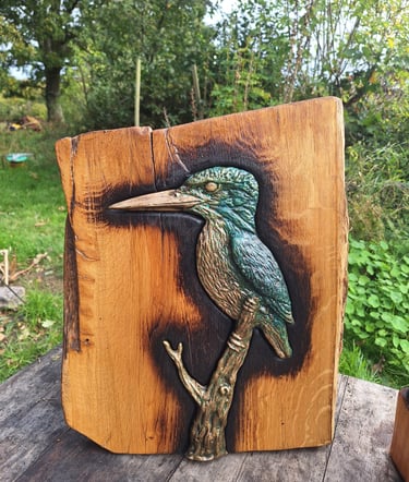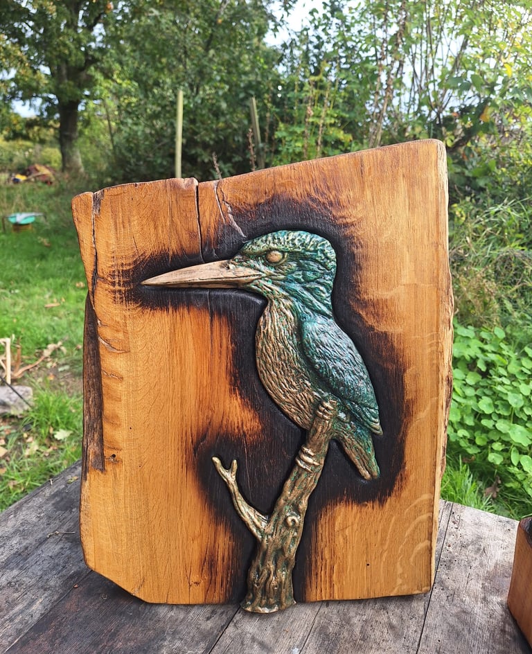 King fisher, bronze relief embedded in oak. 40 x 45 x 5 cm. Guide price £150, starting bid £20.