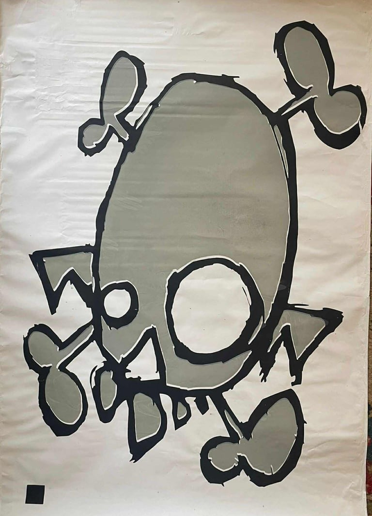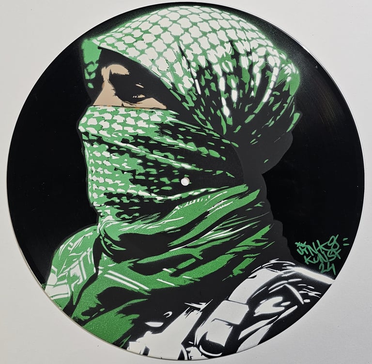 Jinks Kunst- Franco Swiss artist now settled in Nantes, France. Stencil grafitti artist. Exhibited internationally. Painting on vinyl record, 30 x 30 cm.